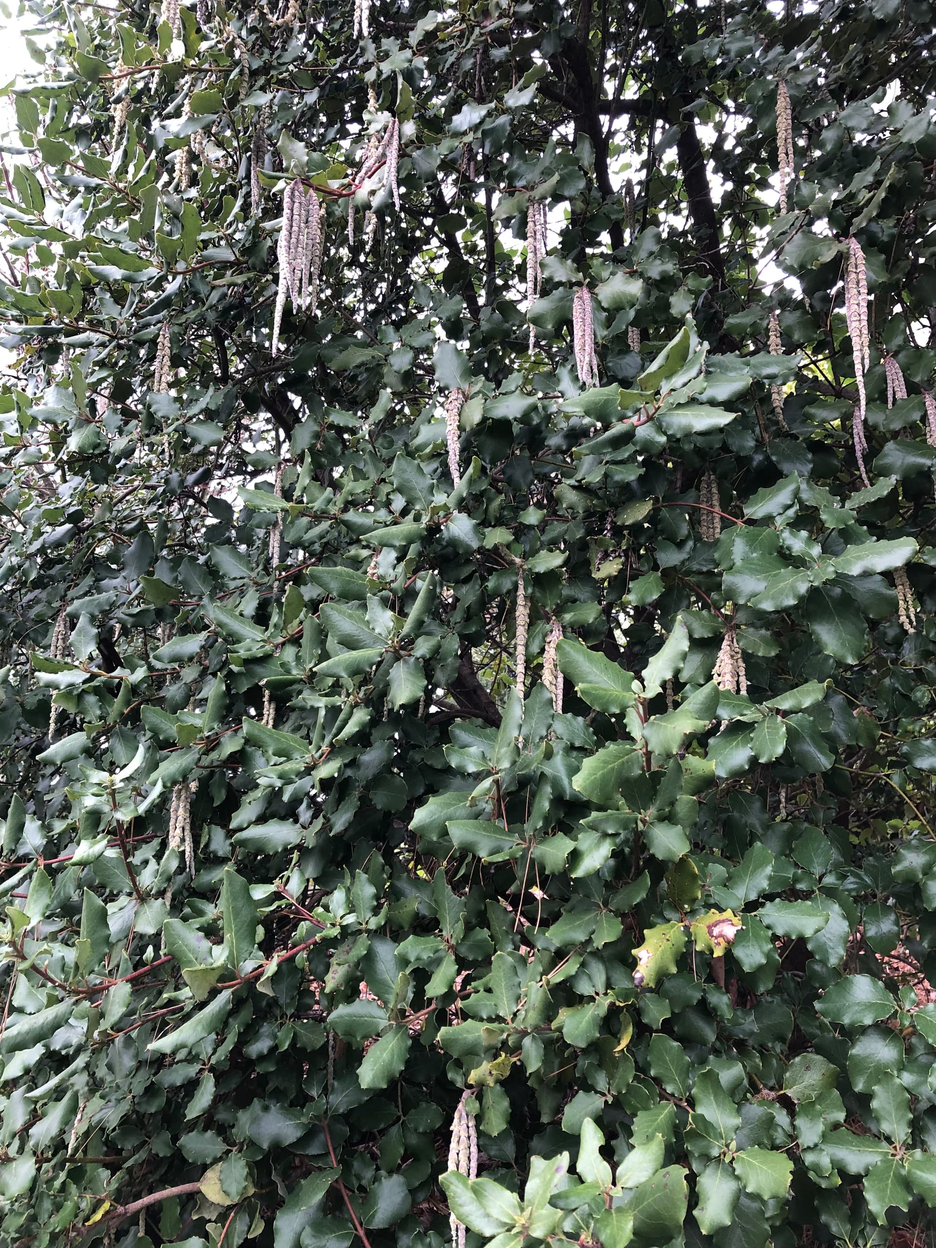 The Silk Tassel Bush is quite tolerant to drought once established, needs very little pruning and deer don’t bother with it much. The evergreen leaves, its medium size (8-16ft) and winter flowers that you’ve discovered are all things that make this plant a nice feature in the winter.