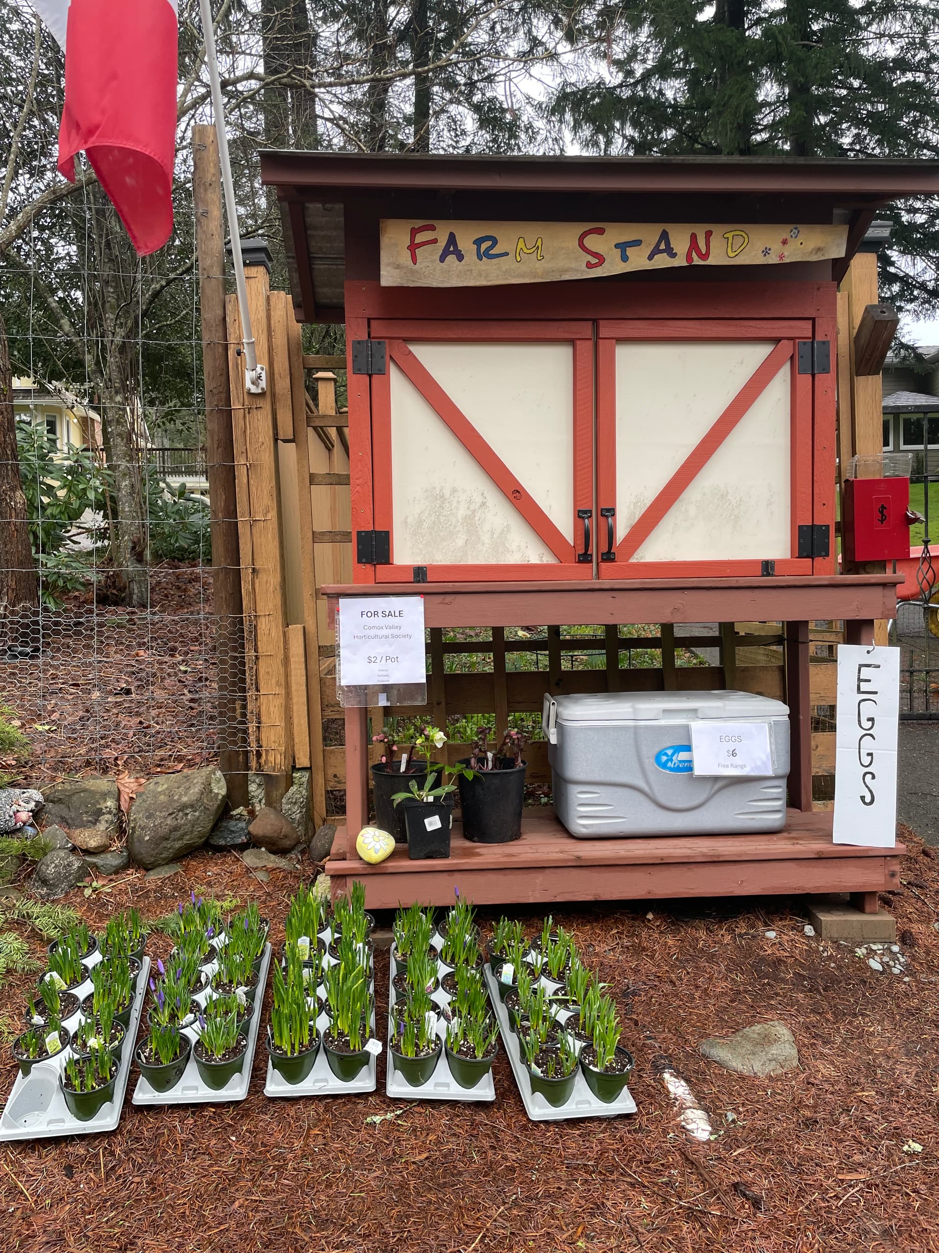 The Farm Stand at 5000 Willis Way is SPRINGing into action. At the end of the season last year we had 4” pots of bulbs donated from a grocery store in Comox; they are now up and starting to bloom. Crocus (Aqua), Daffodils (Tete a Tete), Muscari (Grape Hyacinth) $2 a pot. Also a few Helleborus in bloom, gallon pots $10.
